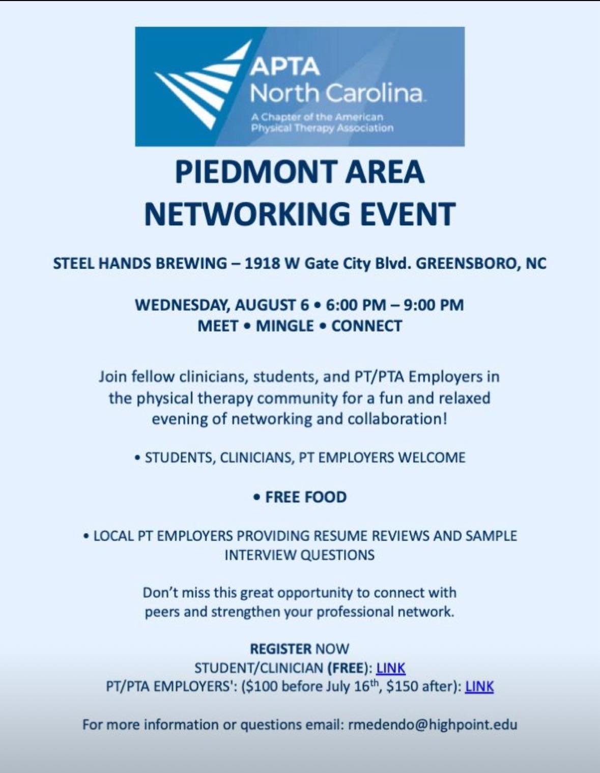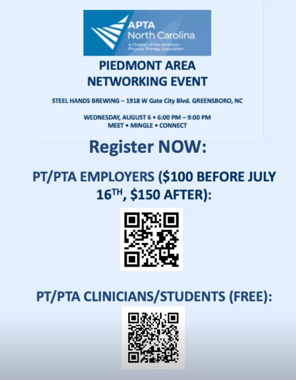 I hope your day is going well. My name is McKinley Pollock and I am the Regional Director for the Piedmont Region of APTA NC. We are hosting a networking event in Greensboro for PT/PTA students, early professionals, seasoned professionals, and hiring vendors. Full details can be found below along with registration information.